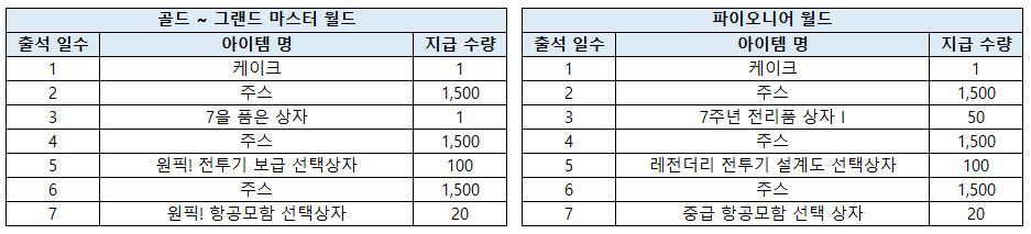 ※ 파이오니어 월드에서는 ‘7주년 전리품 상자 I’이 지급되며, 그 외 월드에서는 ‘7주년 전리품 상자 II’가 지급됩니다.