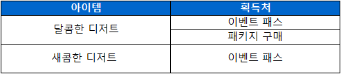 - 이벤트 기간 동안 이벤트 패스를 진행하고, 달콤한 디저트와 새콤한 디저트를 모아 다양한 보상으로 교환하세요!