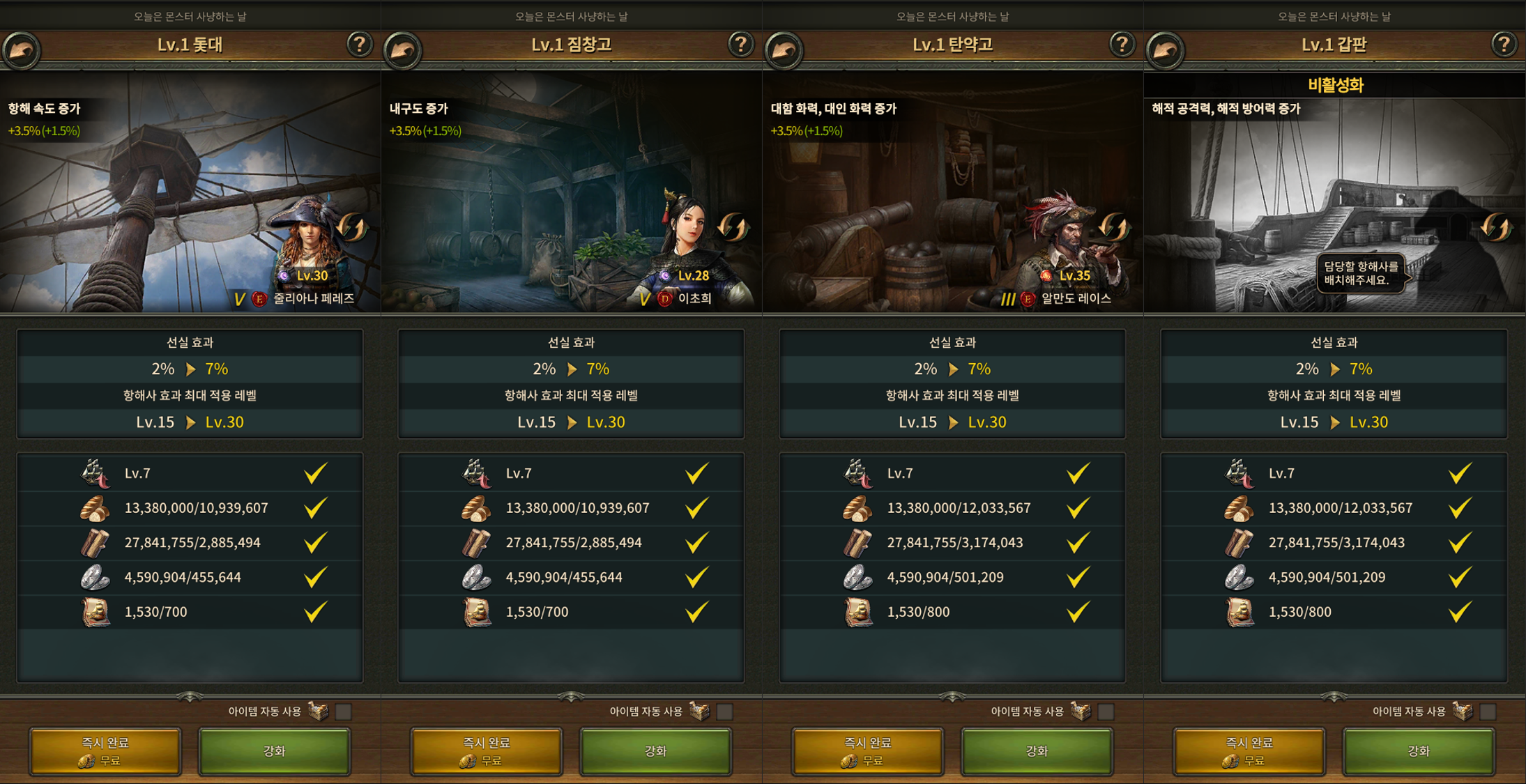- 기함 성장 시 선실을 강화할 수 있으며, 선실 강화 레벨이 높아질수록 항해사 레벨에 따른 추가 효과도 증가합니다.