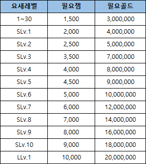 ■ 요새 레벨에 따른 서버 이동에 필요한 젬수량