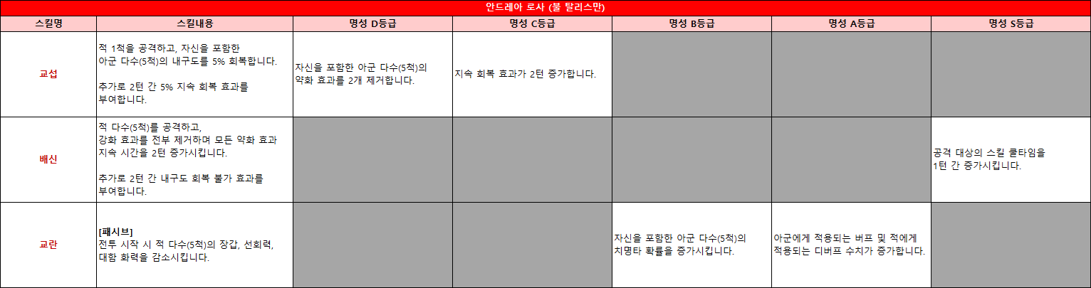 ㄴ 또한, 안드레아 로사(불 탈리스만)는 적의 강화 효과를 제거하고 약화 효과의 지속 시간을 증가시켜 상대의 전투 템포를 무너뜨리며,